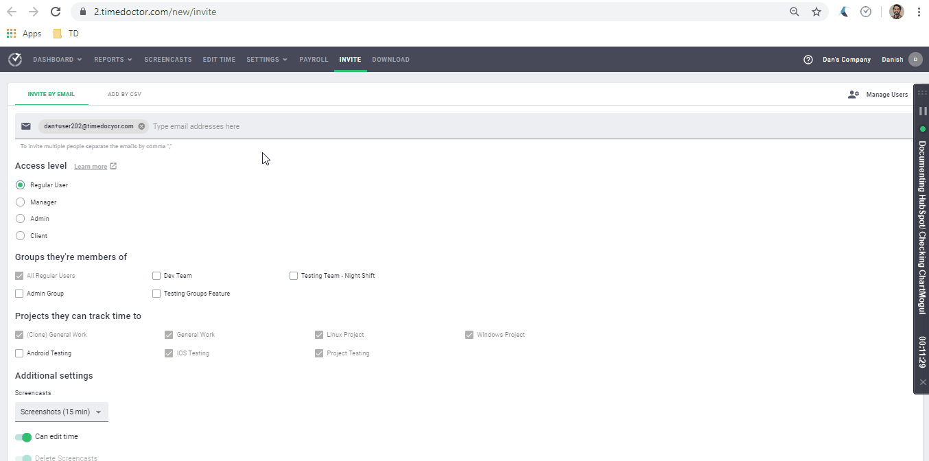Assign Access level, Groups, Projects, and configure Screencasts and Edit time before sending.