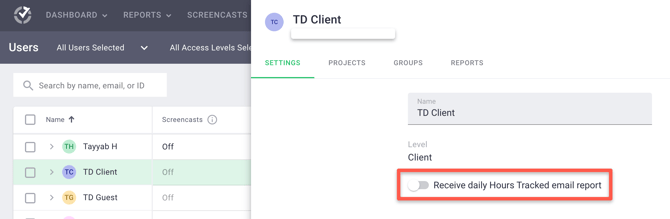 Configure on Settings → Users for the client account to receive the Daily Hours Tracked email report.